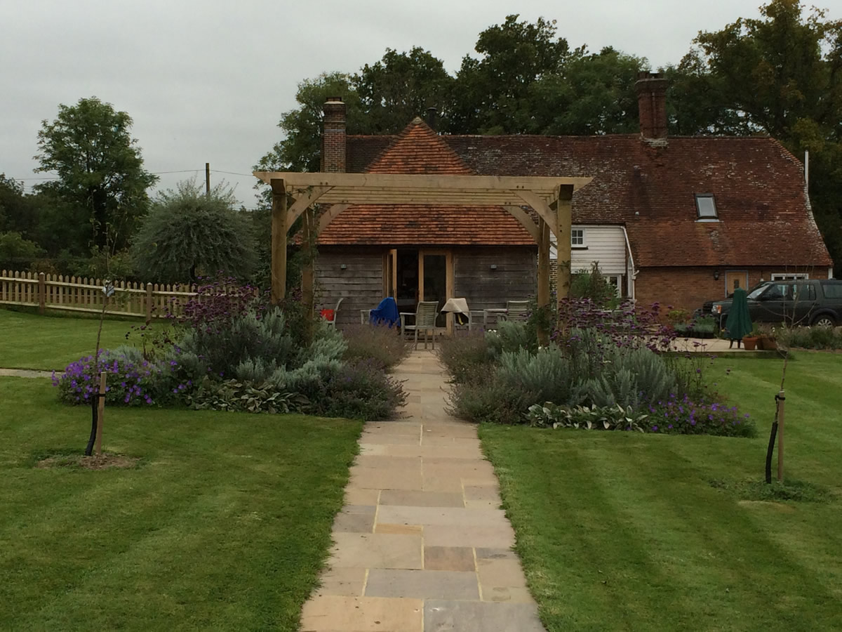 To make the most of this new room they wanted an extensive seating area close to the house and also to break up the old, rather utility, parking area.