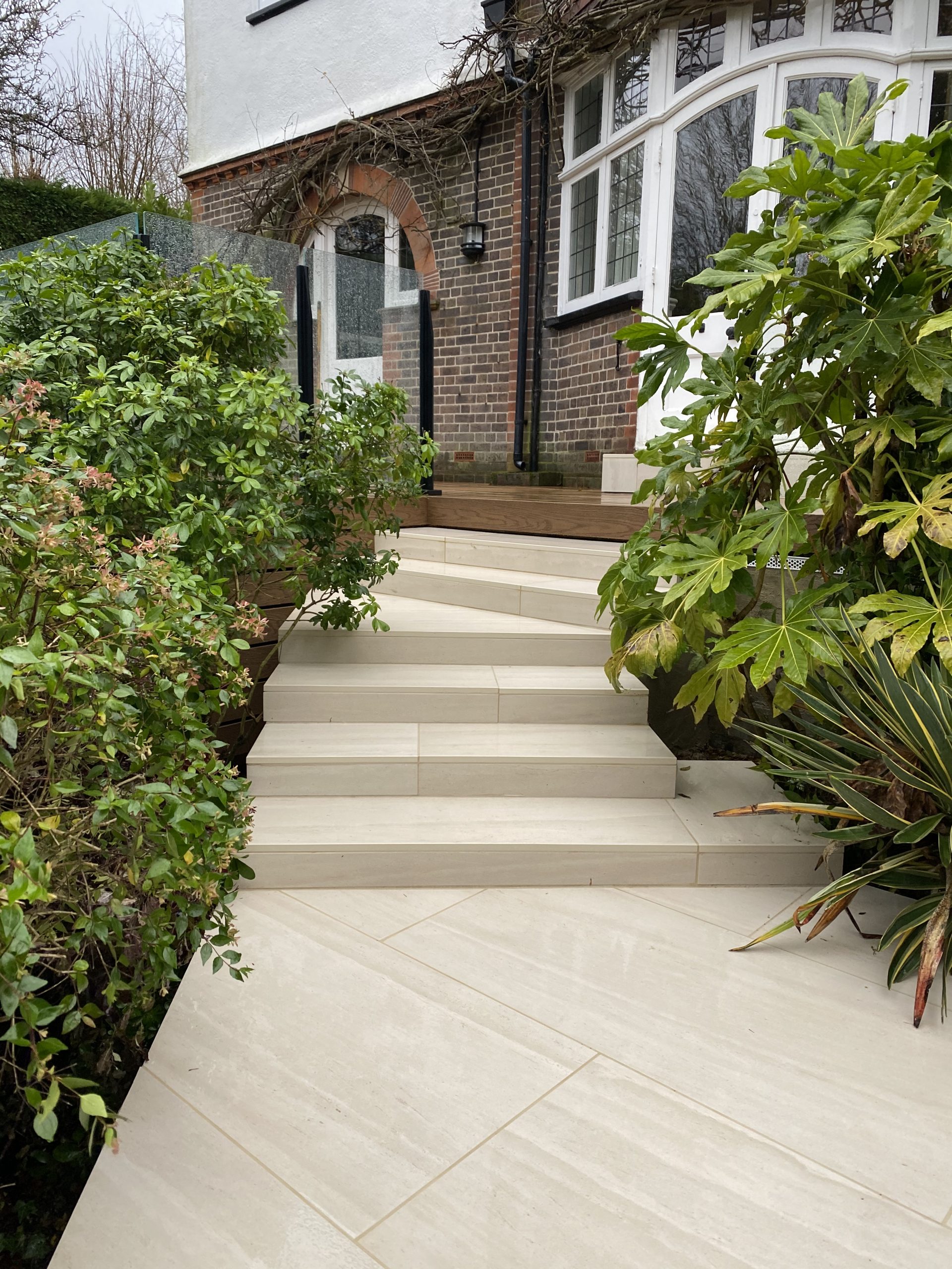 Porcelain is a great product and looks great in the garden creating clean crisp contemporary lines and can be complemented with a wide range of other materials artificial grass being one as clean and dirt free.
